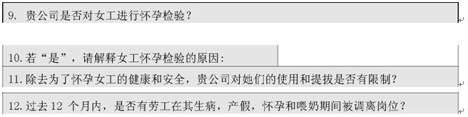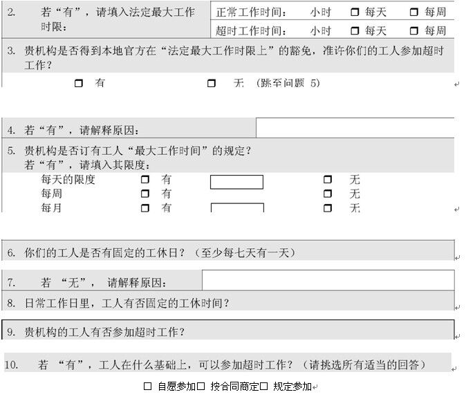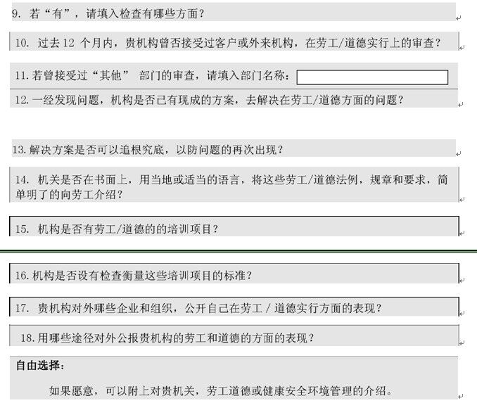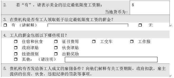 2. 請填入以下包括在貴公司的勞工和道德文件內的各點:勞工□ 自由挑選職業(如:無強制使用,無抵押束縛,不自愿的勞工或監犯勞工)□ 不征用童工 (如:無未滿法定年齡勞工,青少年勞工不參加危險作業) □ 不歧視 (如:年齡,種族,性別,宗教,性和政治傾向等) □ 人道待遇 (如:無凌辱,無強迫,無性騷擾或刑罰) □ 法定最低限度工資 (如:法定工資,超時工資等都清楚講明)□ 工時制度 (如:有最長工作時間限度制,有強制性工休日) □ 自由組織社團 (如:工會,集體議價,公開對話) 道德□ 經營道德(如:無貪圬,賄賂,敲詐勒索,盜用或弄虛作假)□ 信息公開 (如:生意活動,結構,財政狀況) □ 不正當取利(如:不以賄賂或其它不良手段而取利) □ 公道營業 (如:廣告和競爭,保護客戶信息) □ 身份保密(如:工人可以匿名報告違章活動) □ 知識產業 (如:保護合作伙伴的知識財產權)